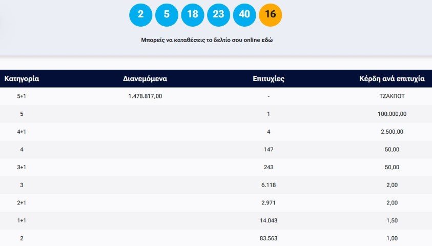 Οι τυχεροί αριθμοί ήταν οι: 2, 5, 18, 23, 40 και τζόκερ το 16.