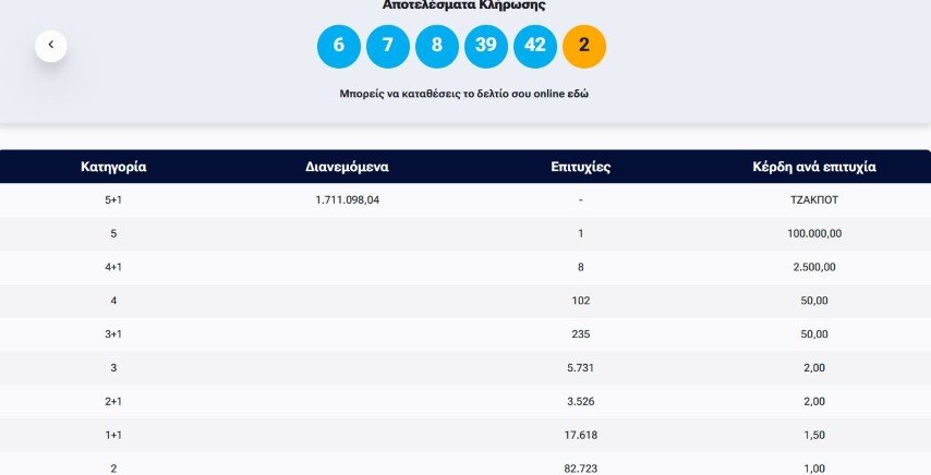 Οι τυχεροί αριθμοί ήταν οι: 6, 7, 8, 39, 42 και τζόκερ το 2.