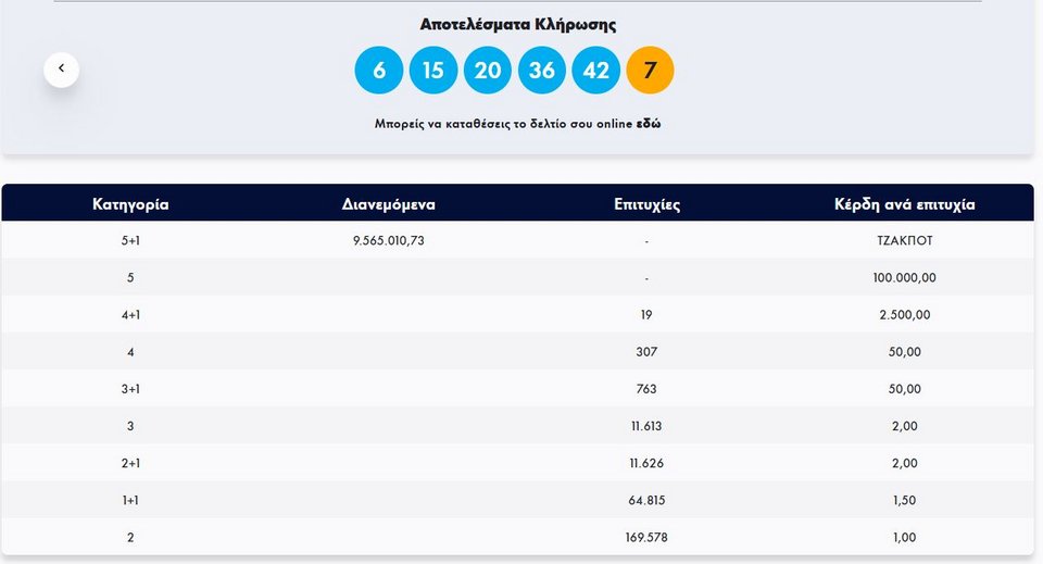 Οι αριθμοί που κληρώθηκαν είναι οι εξής: 6, 15, 20, 36, 42 και τζόκερ ο αριθμός 7.