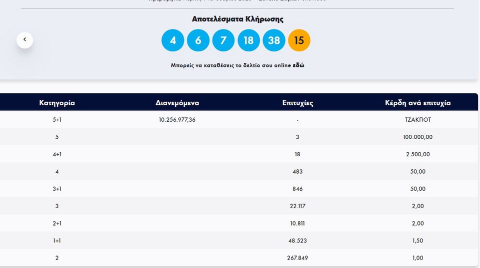 Οι αριθμοί που κληρώθηκαν σήμερα είναι οι εξής: 4, 6, 7, 18, 38 και αριθμός τζόκερ το 15.