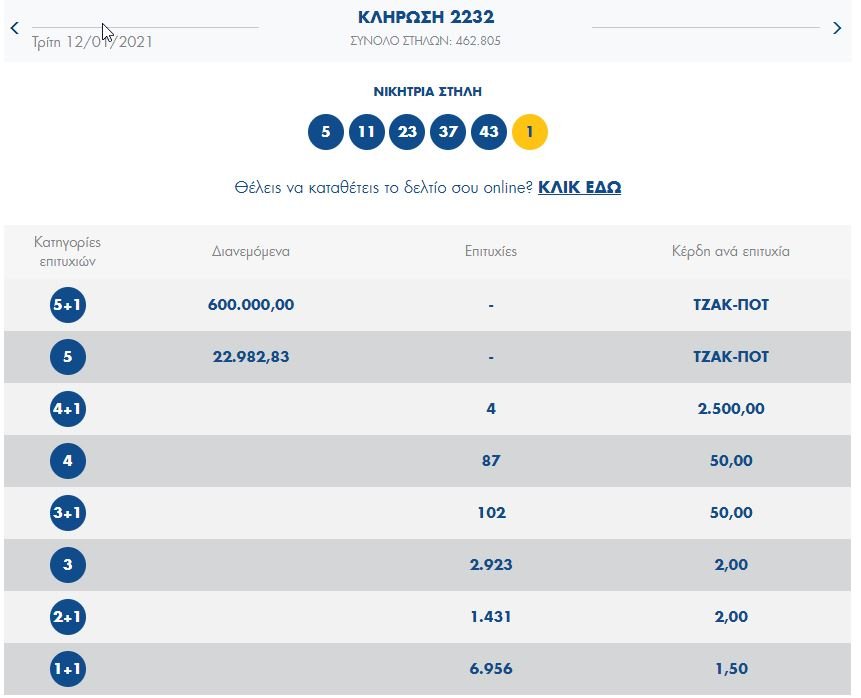 Οι αριθμοί που κερδίζουν: 5, 11, 23, 37, 43 και Τζόκερ το 1.