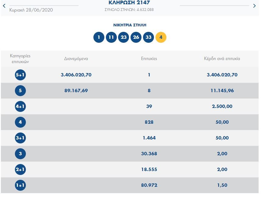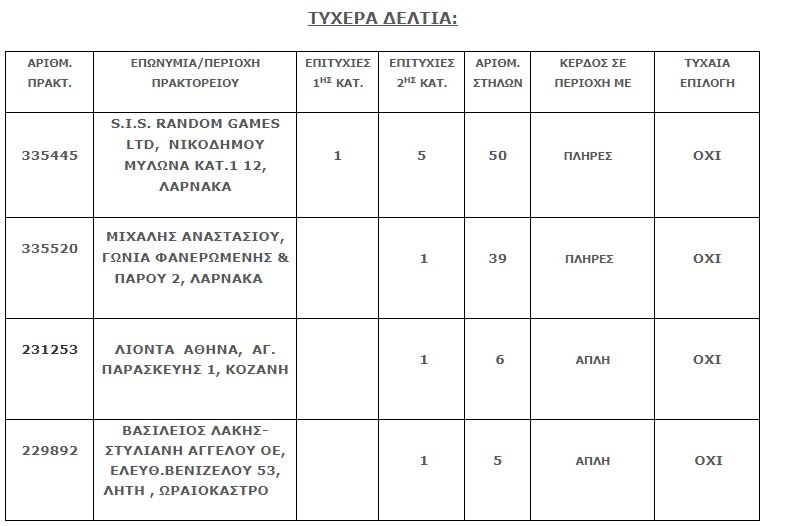 Το τυχερό δελτίο παίχτηκε στο πρακτορείο SIS Randon Games του Ν. Μυλωνά στην Λάρνακα και ήταν ένα πλήρες δελτίο που εκτός από την πρώτη κατηγορία είχε και πέντε επιτυχίες στην δεύτερη κατηγορία η οποία μοίρασε από 11.145,96 ευρώ έκαστος.