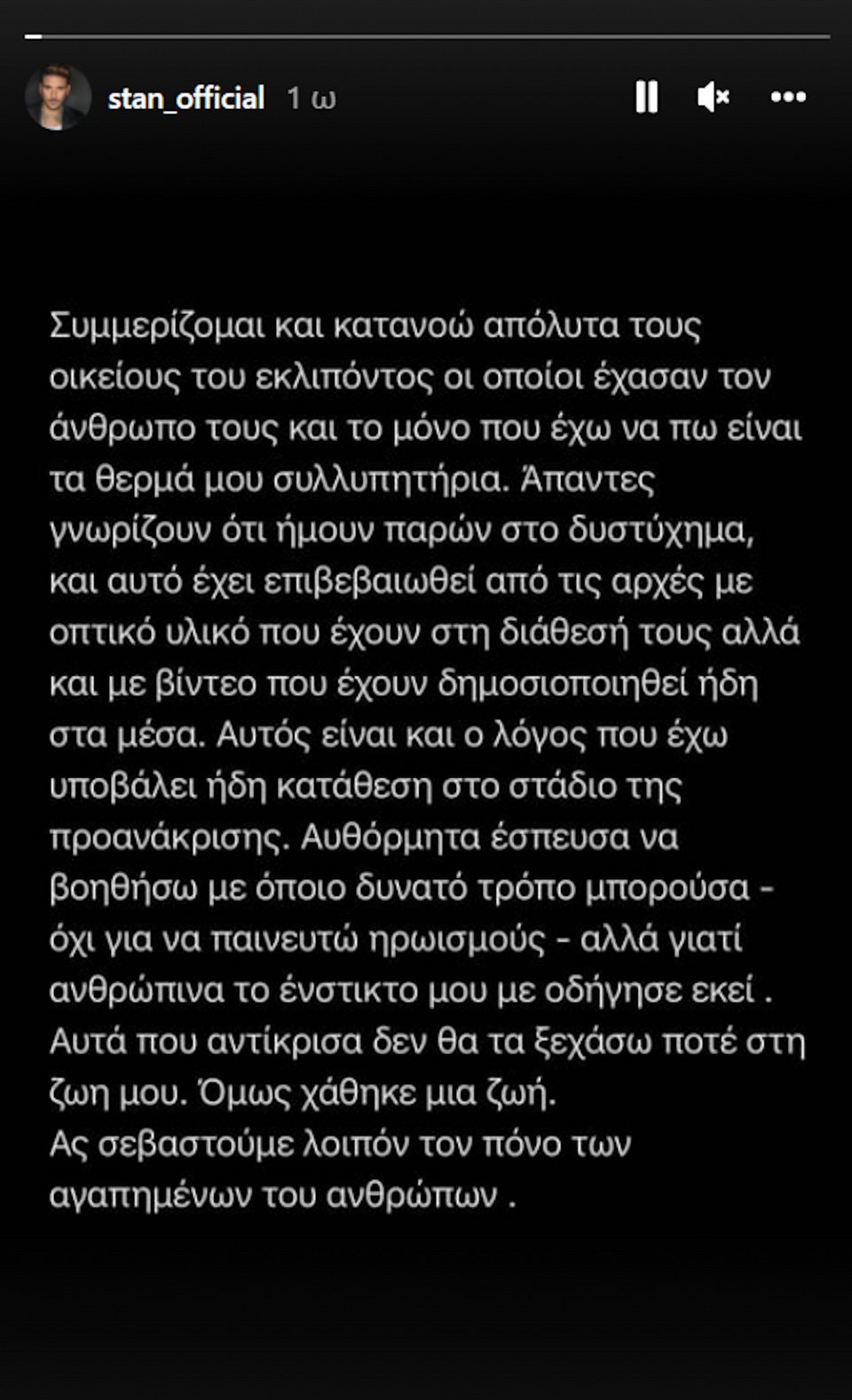 «Συμμερίζομαι και κατανοώ απόλυτα τους οικείους του εκλιπόντος οι οποίοι έχασαν τον άνθρωπό τους και το μόνο που έχω να πω είναι τα θερμά μου συλλυπητήρια. Άπαντες γνωρίζου ότι ήμουν παρών στο δυστύχημα, και αυτό έχει επιβεβαιωθεί από τις αρχές με οπτικό υλικό που έχουν στη διάθεση τους αλλά και με βίντεο που έχουν δημοσιοποιηθεί ήδη στα μέσα. Αυτός είναι και ο λόγος που έχω υποβάλει ήδη κατάθεση στο στάδιο της προανάκρισης. Αυθόρμητα έσπευσα να βοηθήσω με όποιο δυνατό τρόπο μπορούσα -όχι για να παινευτώ ηρωισμούς- αλλά γιατί ανθρώπινα το ένστικτό μου με οδήγησε εκεί. Αυτά που αντίκρισα δεν θα τα ξεχάσω ποτέ στη ζωή μου. Όμως χάθηκε μία ζωή. Ας σεβαστούμε λοιπόν τον πόνο των αγαπημένων του ανθρώπων», έγραψε ο Stan σε story στο Instagram.