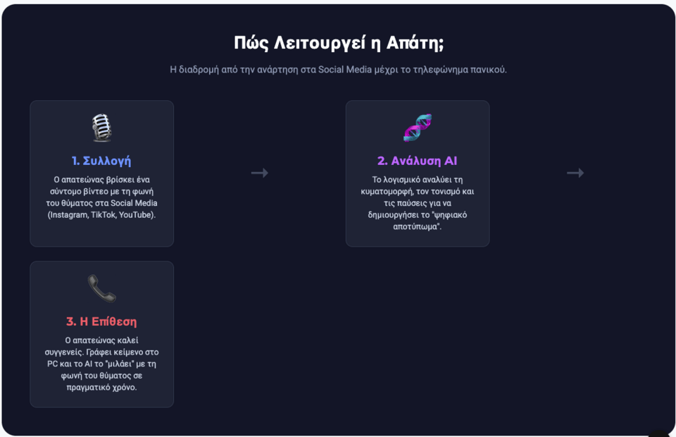 Οι πλατφόρμες αυτές, αν και σχεδιάστηκαν για θεμιτούς σκοπούς -όπως η δημιουργία audiobooks, η βοήθεια σε άτομα που έχουν χάσει τη φωνή τους λόγω ασθένειας, ή η μεταγλώττιση ταινιών- έχουν μετατραπεί σε όπλα στα χέρια επιτήδειων. Όπως χαρακτηριστικά αναφέρεται στις αναφορές ασφαλείας, οι εγκληματίες μπορούν να «αλιεύσουν» φωνητικά δεδομένα από βίντεο στα μέσα κοινωνικής δικτύωσης (TikTok, Instagram, Facebook), από φωνητικά μηνύματα, ή ακόμα και από σύντομες τηλεφωνικές κλήσεις, δημιουργώντας έτσι μια δεξαμενή «πρώτης ύλης» για τις απάτες τους.