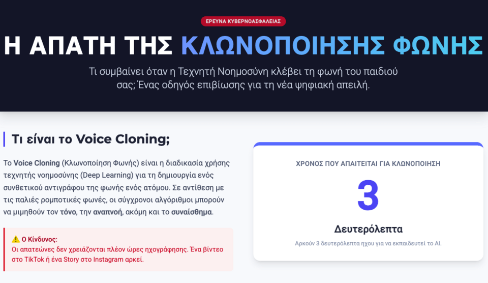 Η Ελλάδα, ως μια κοινωνία με ισχυρούς οικογενειακούς δεσμούς και αυξανόμενη ψηφιακή διείσδυση, αποτελεί γόνιμο έδαφος για τέτοιου είδους απάτες. Αν και η τεχνολογία voice cloning στα ελληνικά μπορεί να παρουσίαζε καθυστερήσεις στο παρελθόν λόγω της πολυπλοκότητας της γλώσσας, τα σύγχρονα μοντέλα AI είναι πλέον πολυγλωσσικά και εξαιρετικά ικανά στην εκμάθηση της ελληνικής προφοράς και τονικότητας.