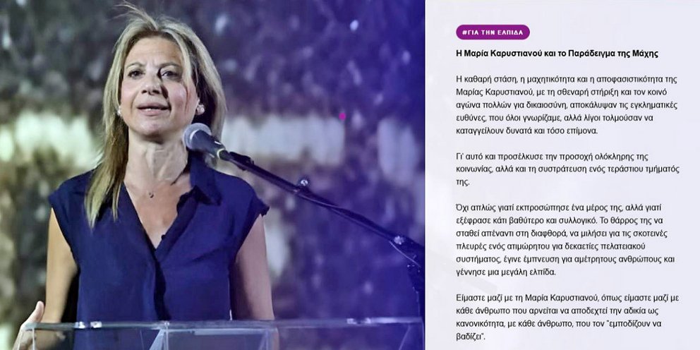 Αναφέρει σε ανάρτησή της στα social media η Μαρία Καρυστιανού: «Ξεκινάμε την πρώτη του μήνα για την πρωτιά στη δράση για ΑΛΗΘΕΙΑ και ΔΙΚΑΙΟΣΥΝΗ! Από το "Εγώ" στο "Εμείς"! Υπάρχουν στιγμές στην ιστορία ενός τόπου που η σιωπή γίνεται πιο βαριά από την ίδια την αδικία. Σε μια τέτοια στιγμή, επιλέξαμε να μιλήσουμε. Όχι γιατί είναι εύκολο, αλλά γιατί είναι το μόνο που μπορεί να μας κρατήσει όρθιους και να διατηρήσει την ΕΛΠΙΔΑ ζωντανή.