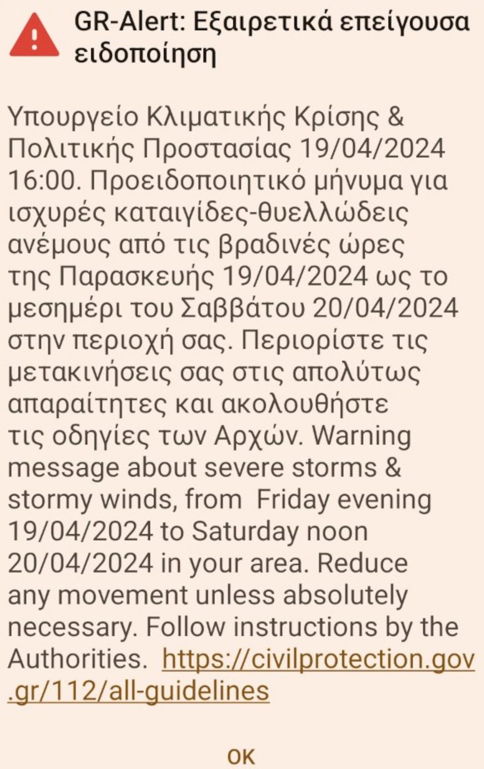 «Προειδοποιητικό μήνυμα για ισχυρές καταιγίδες - θυελλώδεις ανέμους από τις βραδινές ώρες της Παρασκευής 19/4 έως το μεσημέρι του Σαββάτου 20/4 στην περιοχή σας», αναφέρει το SMS που έλαβαν οι κάτοικοι των περιοχών στις οποίες αναμένεται να χτυπήσει η κακοκαιρία.