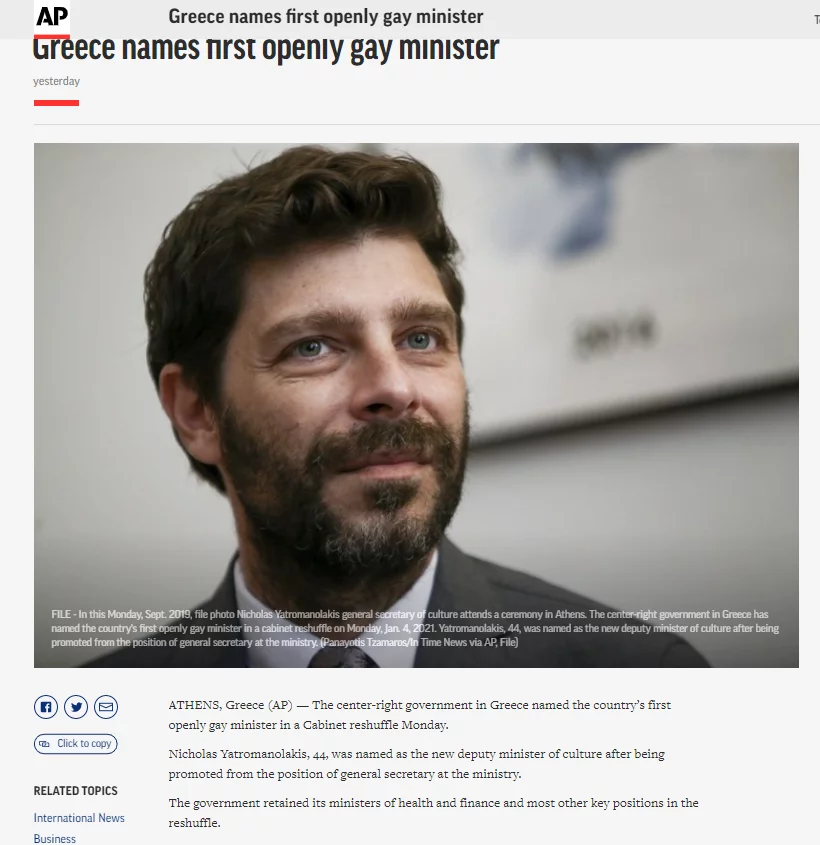 Έχει ενδιαφέρον ότι στο κείμενο αναφέρεται πως η «κεντροδεξιά κυβέρνηση» τοποθέτησε το πρώτο ανοιχτά ομοφυλόφιλο μέλος ελληνικής κυβέρνησης. Τονίζει ότι πρόκειται για αναβάθμιση του Νικόλα Γιατρομανωλάκη από τη θέση του γενικού γραμματέα Σύγχρονου Πολιτισμού, ενώ ακολουθεί αναφορά στο γεγονός ότι οι υπουργοί Οικονομικών και Υγείας παρέμειναν στις θέσεις τους.