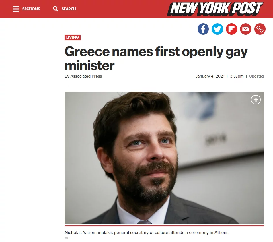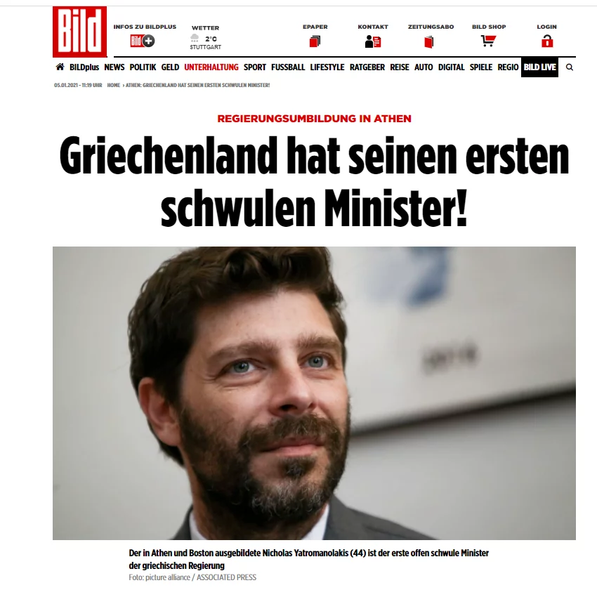 Ηταν το Associated Press αυτό που πρώτο μετέδωσε την είδηση και έφτασε σε όλα τα διεθνή μέσα ενημέρωσης ανά τη Γη. Eξι λέξεις στον τίτλο, που καταγράφηκε ως ιστορικός: Greece names first openly gay minister, δηλαδή «Η Ελλάδα ορίζει τον πρώτο ανοιχτά γκέι υπουργό».