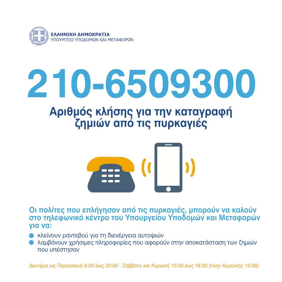 Στο υπουργείο Υποδομών και Μεταφορών λειτουργεί τηλεφωνικό κέντρο με αριθμό 210-6509300 με οκτώ τηλεφωνικές γραμμές από τις 8:00 έως τις 20:00 τις καθημερινές και 10:00 έως 18:00 το Σαββατοκύριακο για την εξυπηρέτηση των πολιτών που επλήγησαν από τις πυρκαγιές.