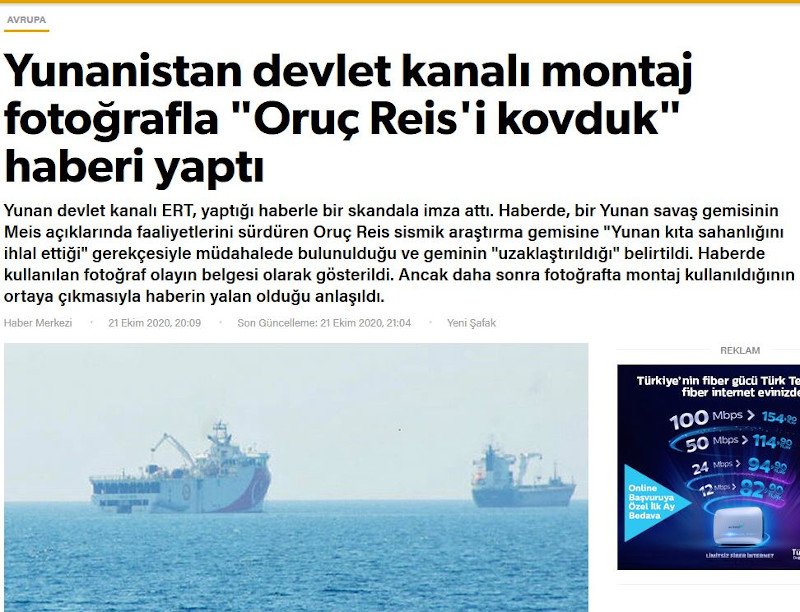 «Σκάνδαλο στις ειδήσεις του ελληνικού κρατικού δικτύου ΕΡΤ. Στο ρεπορτάζ του ανέφερε ότι το σκάφος σεισμικών ερευνών Οruc Reis, που επιχειρεί ανοικτά των ακτών του Μεϊς, “απομακρύνθηκε” από ελληνικό πολεμικό πλοίο με το επιχείρημα ότι “παραβίασε την ελληνική υφαλοκρηπίδα”. Μάλιστα χρησιμοποιήθηκε στο ρεπορτάζ ως απόδειξη και μια φωτογραφία. Αλλά όπως αποκαλύφθηκε αργότερα η φωτογραφία είχε υποστεί μοντάζ και το ρεπορτάζ ήταν ψευδές», ισχυρίζεται στην ηλεκτρονική της έκδοση η Yeni Safak.