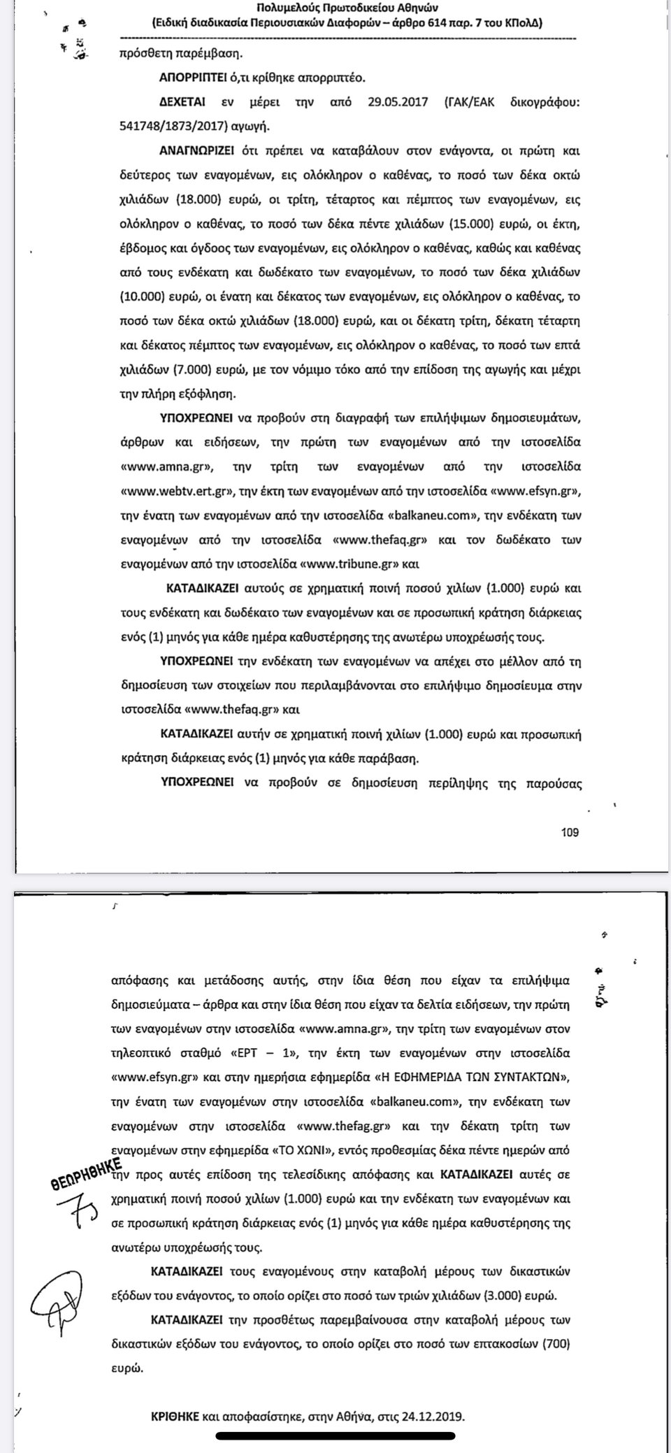 Καταδικάστηκαν όλα τα πρόσωπα και ΜΜΕ κατά των οποίων είχε προσφύγει ο δημοσιογράφος για το ψευδές τηλεγράφημα του Αθηναϊκού Πρακτορείου Ειδήσεων, επί κυβέρνησης ΣΥΡΙΖΑ, της Δημόσιας Τηλεόρασης και των ψευδών δημοσιευμάτων που τον εμφάνιζαν ως συλληφθέντα και κατηγορούμενο από τις αμερικανικές Αρχές για σειρά αδικημάτων.
