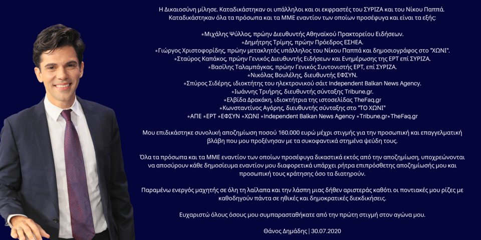 «Η Δικαιοσύνη μίλησε. Καταδικάστηκαν οι υπάλληλοι και οι εκφραστές του ΣΥΡΙΖΑ και του Νίκου Παππά. Καταδικάστηκαν όλα τα πρόσωπα και τα ΜΜΕ εναντίον των οποίων προσέφυγα και είναι τα εξής:
