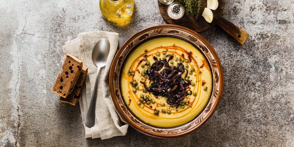 Βελούδινη φάβα με καραμελωμένα κρεμμύδια και κάπαρη