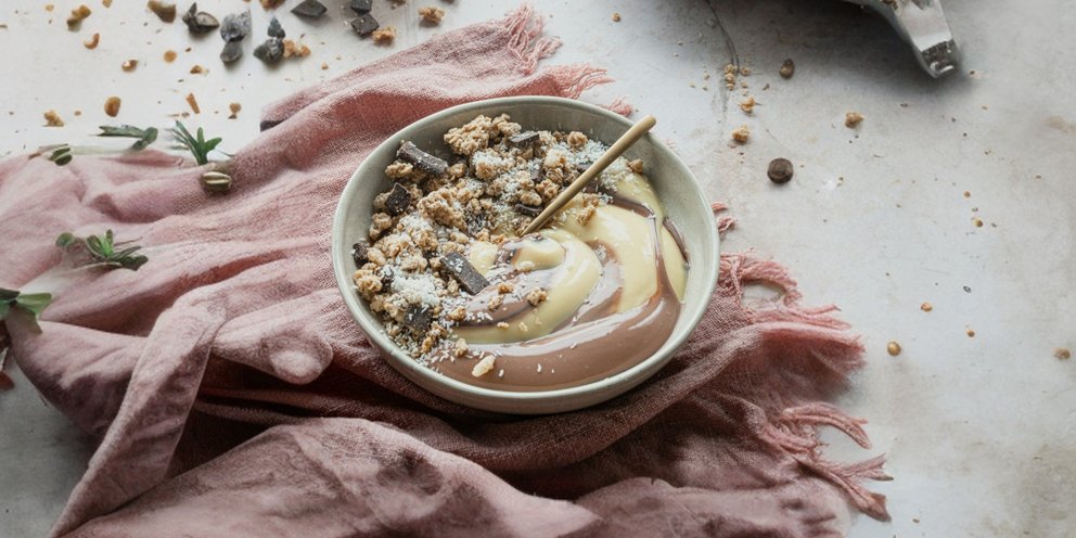Η σπιτική κρέμα είναι το γλυκό στο οποίο δε λέμε ποτέ όχι. Αυτό το βελούδινο μείγμα που γίνεται σε χρόνο μηδέν, και τρώγεται ζεστό ή κρύο, μας ακολουθεί από τη βρεφική ηλικία μέχρι την ενήλικη ζωή ως η απόλυτη γλυκιά λιχουδιά. Είναι τόσο δημοφιλής άλλωστε που κυκλοφορεί στην αγορά σε άπειρες εκδοχές, από προκάτ μείγματα στα ράφια μέχρι έτοιμες εκδοχές στα ψυγεία των σούπερ μάρκετ και φυσικά φρεσκοφτιαγμένη στα παραδοσιακά γαλακτοπωλεία. Το να την κάνουμε μόνοι μας στο σπίτι βέβαια είναι πανεύκολο αφού θέλει απλά υλικά και λίγο χρόνο. Και το καλύτερο; Είναι η μόνη μας ευκαιρία να τη φάμε ζεστή, όπως ακριβώς της αξίζει. Στη συνταγή που σας δίνουμε συνδυάζουμε δύο αγαπημένες γεύσεις, βανίλια και σοκολάτα, τις οποίες συνδυάζουμε με λίγη γκρανόλα που δίνει τραγανή υφή και τους πάει πολύ.