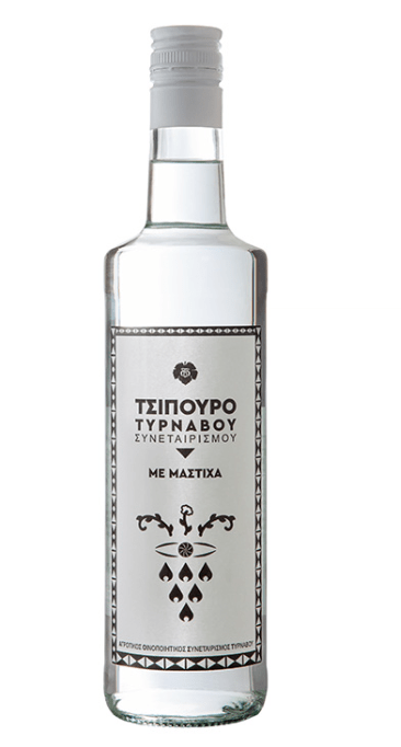 Τσίπουρο Τυρνάβου με Μαστίχα Χίου του Συνεταιρισμού. Ο αρωματισμός γίνεται επαναποστάζοντας το μονοποικιλιακό τσίπουρο από Μοσχάτο Τυρνάβου με προσθήκη μαστίχας Χίου.
