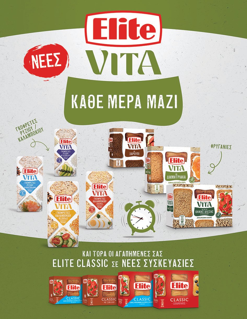 Η Elite, πιστή στις αξίες που την ανέδειξαν ως κορυφαία μάρκα φρυγανιάς στην Ελλάδα, έρχεται με τη νέα σειρά Elite VITA να ανανεώσει ριζικά την κατηγορία και να την επεκτείνει, προσφέροντας νέες απολαυστικές και ποιοτικές προτάσεις πρωινού και snacking για όλη την ημέρα στους καταναλωτές που επιλέγουν μια ισορροπημένη διατροφή και προϊόντα υψηλής διατροφικής αξίας.