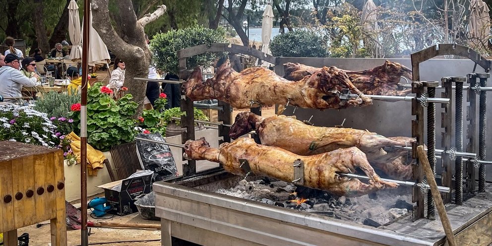 Κάθε σούβλα έχει τρεις πιρούνες-δαγκάνες μία στο κάτω μέρος, μία στη μέση και μία ψηλά. Ξεκινάμε από κάτω και περνάμε τη σούβλα παράλληλα. Ο σκοπός είναι η κάτω πιρούνα να φτάσει στη βάση των πίσω ποδιών (περνάμε το ένα πόδι μέσα στον άλλο). Όταν οι άκρες της πιρούνας είναι εκεί που τα μπούτια συνδέονται με τον κορμό τη βιδώνουμε πολύ σφιχτά ώστε να μην κουνιέται καθόλου (ούτε η σούβλα, ούτε το κρέας). Συνεχίζουμε το παράλληλο πέρασμα της σούβλας (ουρά, κοιλιά κλπ.) με οδηγό τη σπονδυλική στήλη και τη βγάζουμε από τον λαιμό. Γυρνάμε το κεφάλι κάθετα στην άκρη της σούβλας και το πιέζουμε με πολύ δύναμη ώστε να το τρυπήσουμε και να βγει από την άλλη μεριά. Σε αυτή τη φάση βιδώνουμε και την πιρούνα που είναι στη μέση της σπονδυλικής στήλης (για να μη σπάσει το κρέας από το βάρος στο ψήσιμο) και επαναλαμβάνουμε τη διαδικασία με την τρίτη πιρούνα που είναι πιο πάνω, στην πλάτη του αρνιού. Τέλος, τυλίγουμε και σφίγγουμε καλά με σύρμα τους αστραγάλους του αρνιού και τον λαιμό του.