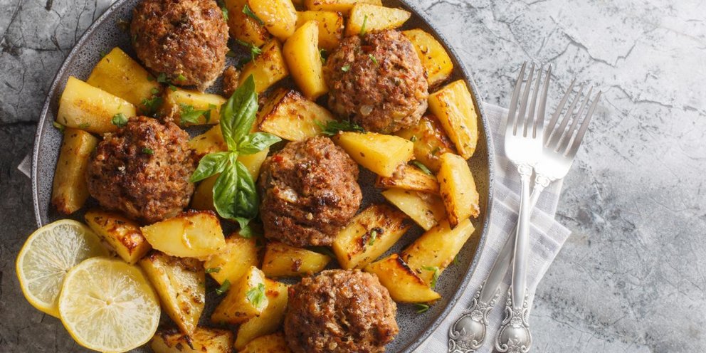 Στη συνταγή που σας δίνουμε ο κιμάς είναι ανάμεικτος (μοσχαρίσιος και χοιρινός) για να βγουν τρυφερά και νόστιμα, χωρίς να είναι πολύ λιπαρά. Ζυμώνονται με ντομάτα, ψωμί και μαϊντανό για να είναι ζουμερά, αφράτα και να μοσχοβολάνε. Ενώ οι πατάτες ψήνονται με μουστάρδα, χυμό πορτοκάλι και μέλι, και λιώνουνς τον στόμα.