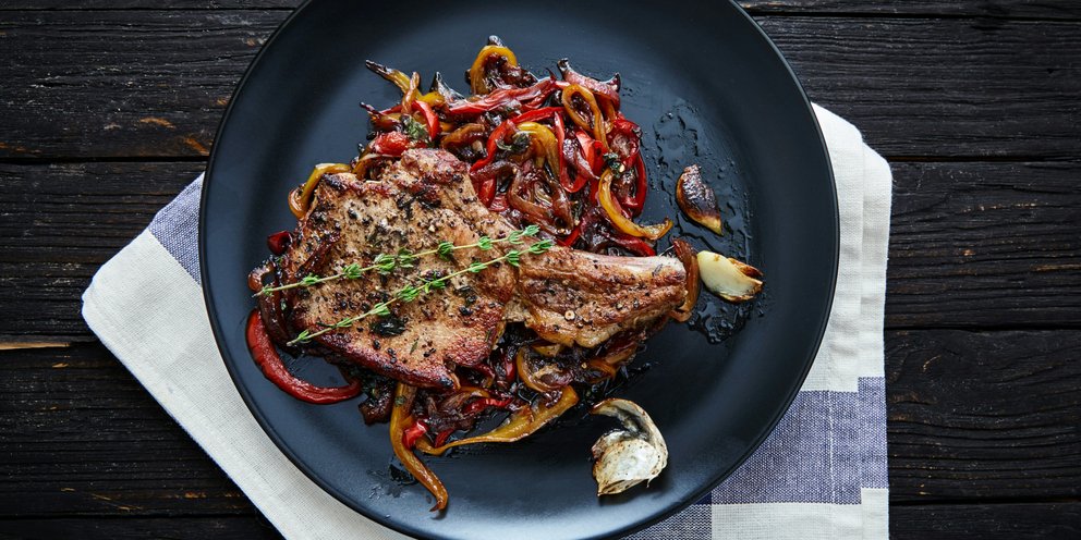 Χοιρινές μπριζόλες, πιπεριές και κρεμμύδια, σαν σε μπάρμπεκιου. Σε μισή ώρα, χωρίς κάρβουνα και φασαρίες.