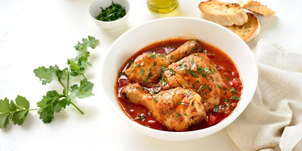 Μια κλασική συνταγή για λαχταριστό κοτόπουλο στην κατσαρόλα με μυρωδάτη σάλτσα ντομάτας.