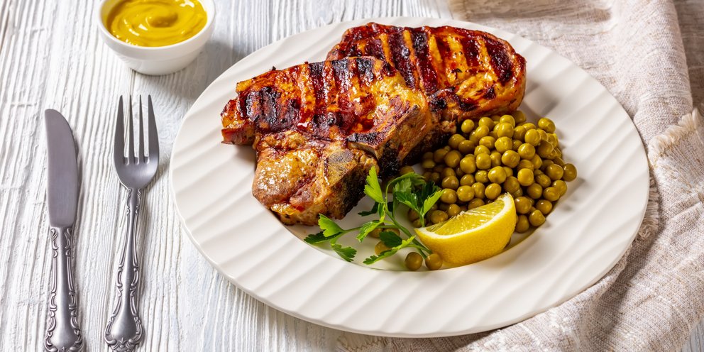 Χοιρινές μπριζόλες με σάλτσα μουστάρδας και αρακά