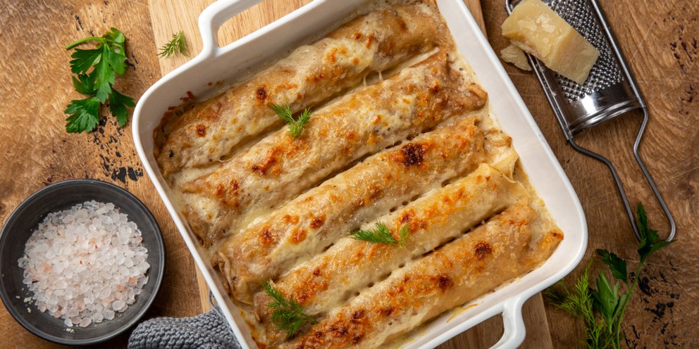 - Τυλίγουμε σε ρολό και τοποθετούμε σε ένα πυρίμαχο σκεύος. Ακολουθούμε την ίδια διαδικασία με όλα τα υλικά και τοποθετούμε τις κρέπες, τη μία δίπλα στην άλλη.