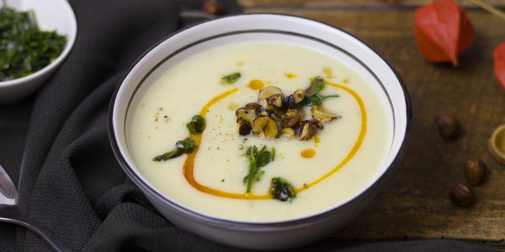 Οι βελουτέ σούπες έχουν την τιμητική τους τον χειμώνα. Όχι μόνο επειδή είναι νόστιμες και θρεπτικές αλλά και γιατί η φίνα, λεπτή τους γεύση ταιριάζει ωραία με τα πληθωρικά φαγητά των επίσημων καλεσμάτων και των γιορτινών τραπεζιών που περιλαμβάνει η εποχή. Από το τραπέζι των Χριστουγέννων λοιπόν μέχρι το πρωτοχρονιάτικο πάρτι μια σούπα βελουτέ είναι πάντα ευπρόσδεκτη, ειδικά όταν περιλαμβάνει αρωματική σελινόριζα, τραγανά μήλα και βελούδινα κάστανα σαν αυτή που σας προτείνουμε. Φτιάξτε αρκετή ποσότητα, κρατήστε την ζεστή και σερβίρετέ την σε βαθιά πιάτα πριν το ψητό χοιρινό ή τη γεμιστή γαλοπούλα. Επίσης, μπορείτε να τη μοιράσετε σε ποτηράκια-μπολάκια και να τα στήσετε στον μπουφέ (σαν σφηνάκια) πλάι στα υπόλοιπα fingerfood.