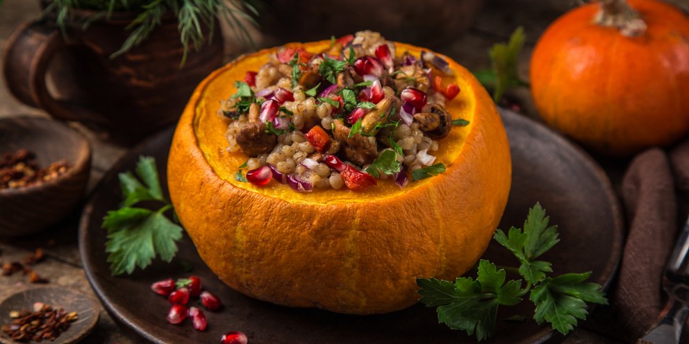 Ένας εντυπωσιακός τρόπος για να μαγειρέψετε και να σερβίρετε ένα συνοδευτικό πιλάφι είναι να γεμίσετε μια ολόκληρη κολοκύθα.