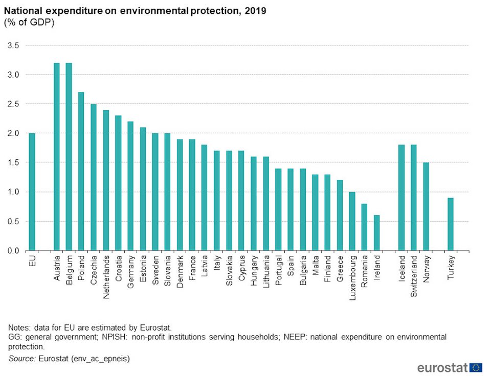 Τα τελευταία 15 χρόνια, οι δαπάνες για την προστασία του περιβάλλοντος ως μερίδιο του ΑΕΠ σε ολόκληρη την ΕΕ παρέμειναν κυμαίνονται στο 2%.