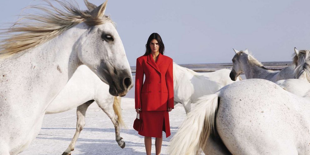 Στη φωτογράφιση, βλέπουμε την Κένταλ Τζένερ να ποζάρει με ένα κατακόκκινο σύνολο που θυμίζει το New Look του Dior από τα ‘50s, και γύρω της να τρέχουν ολόλευκα πόνι, ενώ σε άλλη λήψη το μοντέλο ξαπλώνει στη ράχη ενός αλόγου φορώντας μόνο ένα ζευγάρι μπότες.