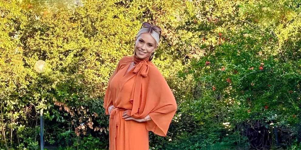 Η Μαρία Μπακοδήμου ποζάρει με μια πορτοκαλί ολόσωμη φόρμα και δίνει ιδέες για τις εμφανίσεις σε γάμο για γυναίκες άνω των 50.