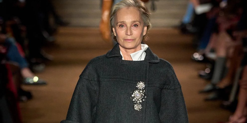 Η 63χρονη ηθοποιός περπάτησε στην πασαρέλα για πρώτη φορά στη ζωή της φορώντας ένα oversized γκρι παλτό σε συνδυασμό με ένα λευκό παντελόνι και ένα ασορτί πουκάμισο, μαζί με μαύρα γάντια.