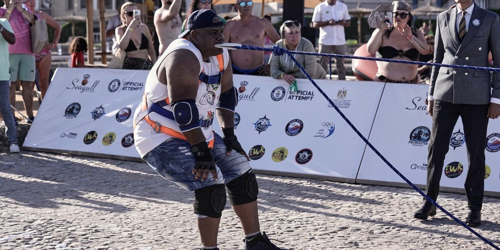 Ένας Αιγύπτιος παλαιστής γνωστός για τα εντυπωσιακά επιτεύγματα του, έσυρε ένα πλοίο 700 τόνων στην Ερυθρά Θάλασσα, χρησιμοποιώντας ένα σχοινί που κρατούσε σφιχτά με τα δόντια του.