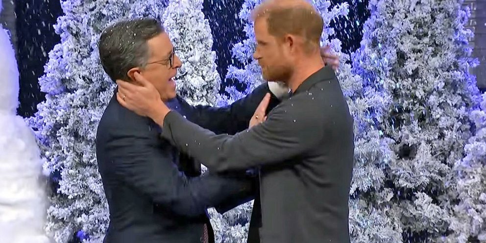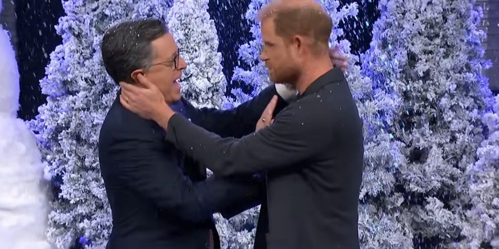 Ο Χάρι διέκοψε ξαφνικά τον μονόλογο του Κόλμπερτ στον οποίο ο παρουσιαστής χλεύαζε τις Hallmark χριστουγεννιάτικες ταινίες με σενάρια γύρω από πρίγκιπες και βασιλικές οικογένειες. «Ειλικρινά νόμιζα ότι αυτή ήταν η οντισιόν για το “Gingerbread Prince saves Christmas in Nebraska”», είπε ο Χάρι βγαίνοντας στη σκηνή. Αστειεύτηκε στη συνέχεια ότι ήθελε να ασχοληθεί με την υποκριτική επειδή ήξερε πόσο «εμμονικοί» ήταν οι Αμερικανοί με τις χριστουγεννιάτικες ταινίες και τη βασιλική οικογένεια. Ο Κόλμπερτ απέρριψε τους ισχυρισμούς και ο Δούκας του Σάσεξ τότε του απάντησε με μία δόση ειρωνείας: «Αλήθεια; Άκουσα ότι εκλέξατε βασιλιά».