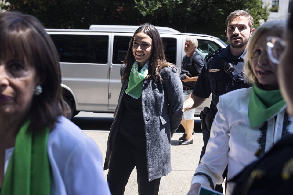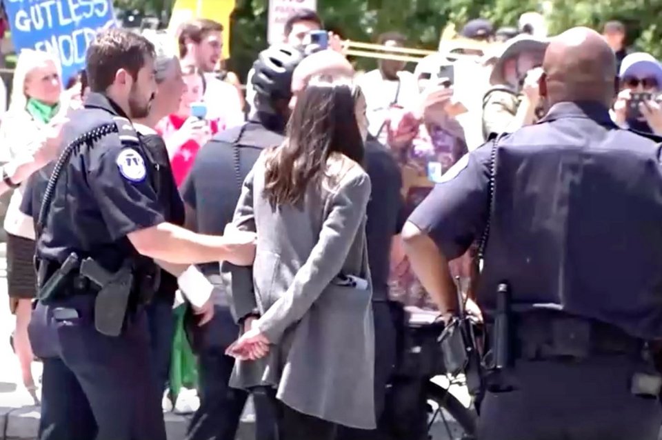 Προχθές, σε μια διαμαρτυρία για το δικαίωμα στην άμβλωση έξω από το Ανώτατο Δικαστήριο, η Οκάσιο Κορτές συνελήφθη για παρεμπόδιση της κυκλοφορίας και έβαλε τα χέρια της πίσω από την πλάτη, καθώς τη συνόδευε ένας αστυνομικός της Αστυνομίας του Καπιτωλίου, κάνοντας όλους να πιστέψουν πως της είχαν περάσει χειροπέδες.