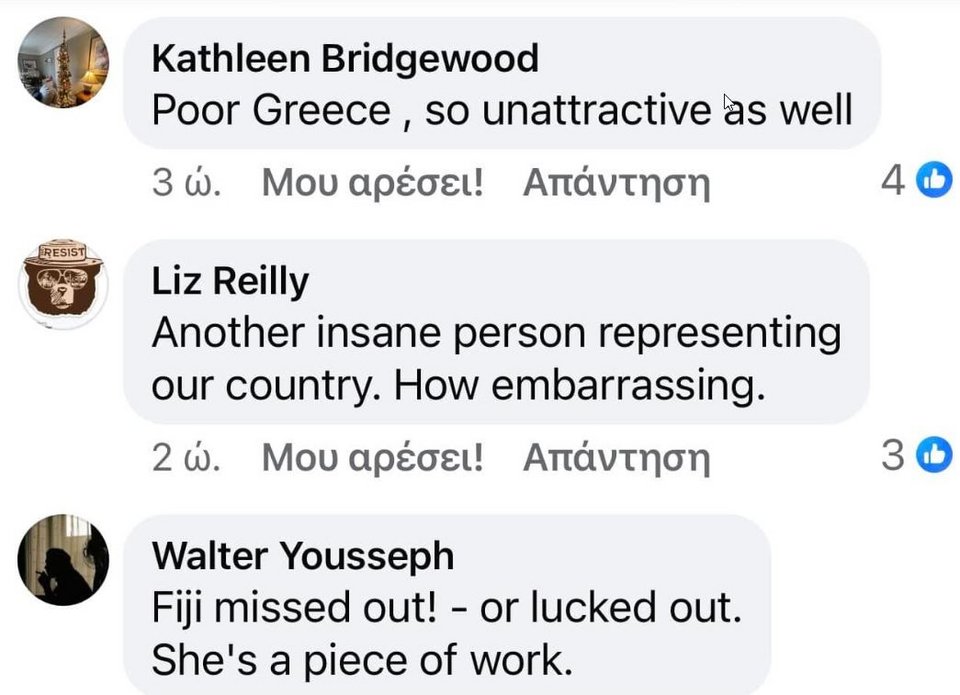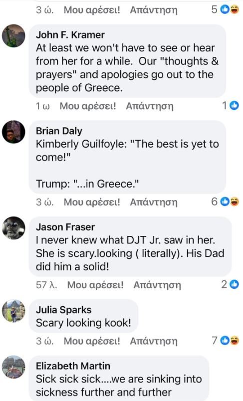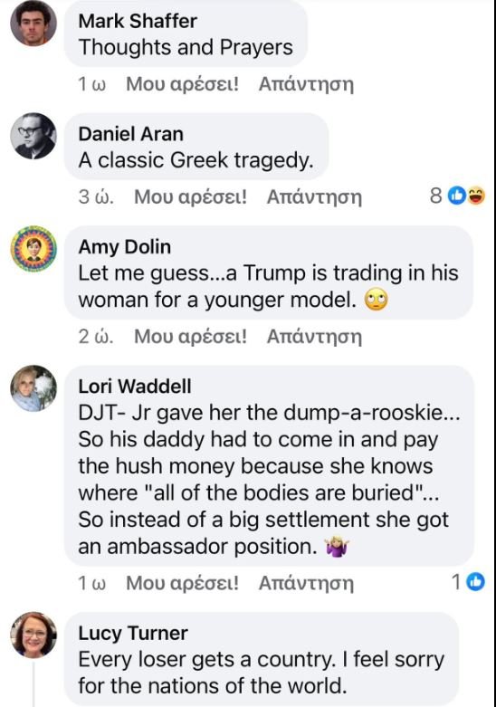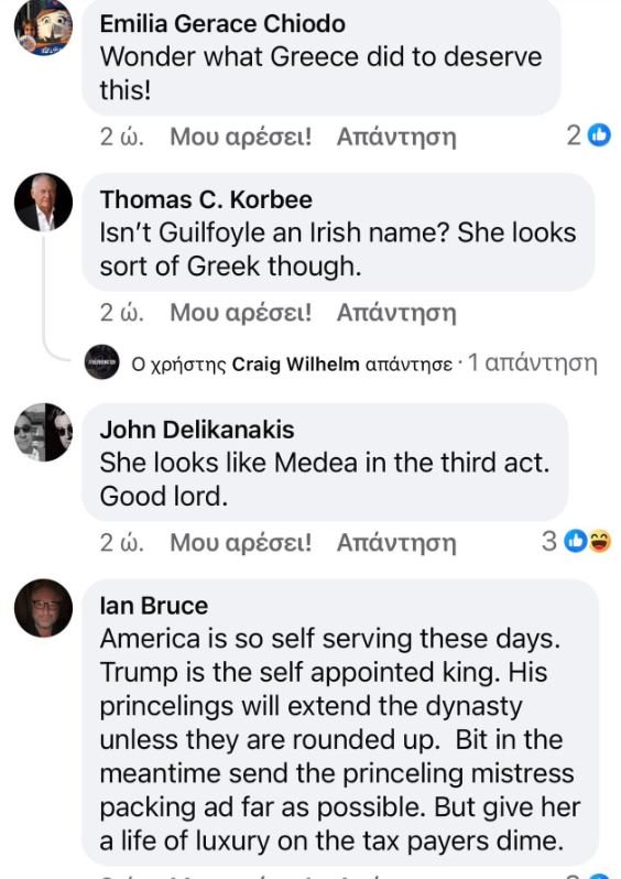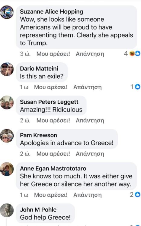 «Εκ των προτέρων συγγνώμη στους Έλληνες», «Ο θεός να τους βοηθήσει», «Αναρωτιέμαι τι έχει κάνει η Ελλάδα για να της αξίζει αυτό», «Κλασική ελληνική τραγωδία», «Τουλάχιστον θα απαλλαγούμε από αυτήν. Οι σκέψεις και οι προσευχές μας, μαζί με μία συγγνώμη, στους πολίτες της Ελλάδας», είναι μόνο μερικά από τα υποτιμητικά σχόλια για την «εκλεκτή» του Τραμπ.
