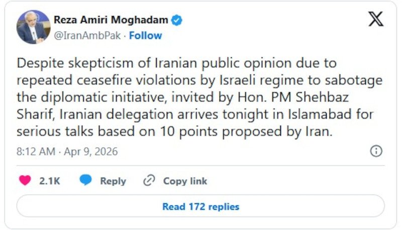 «Παρά τον σκεπτικισμό της ιρανικής κοινής γνώμης, λόγω των επανειλημμένων παραβιάσεων της κατάπαυσης του πυρός από το ισραηλινό καθεστώς με σκοπό να υπονομεύσει τη διπλωματική πρωτοβουλία, κατόπιν πρόσκλησης του κ. πρωθυπουργού Σεμπάζ Σαρίφ, η ιρανική αντιπροσωπεία φτάνει απόψε στο Ισλαμαμπάντ για σοβαρές συνομιλίες με βάση τα 10 σημεία που πρότεινε το Ιράν», ανέφερε χαρακτηριστικά.