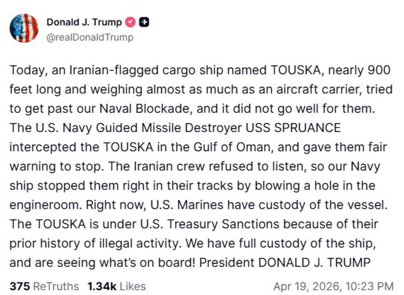 Ο πρόεδρος των ΗΠΑ, Ντόναλντ Τραμπ, επιβεβαίωσε την επιχείρηση σε ανάρτησή του στο Truth Social, υποστηρίζοντας ότι το πλοίο «επιχείρησε να παραβιάσει τον αποκλεισμό και απέτυχε».