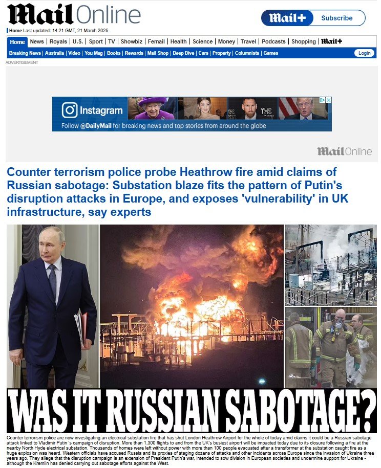 Τώρα, οι ειδικοί αναλύουν αν η Ρωσία θα μπορούσε να συνδέεται με την πυρκαγιά στον υποσταθμό του Ηνωμένου Βασιλείου, η οποία επηρεάζει 679 πτήσεις που έχουν προγραμματιστεί να προσγειωθούν και 678 αναχωρήσεις από το Χίθροου.