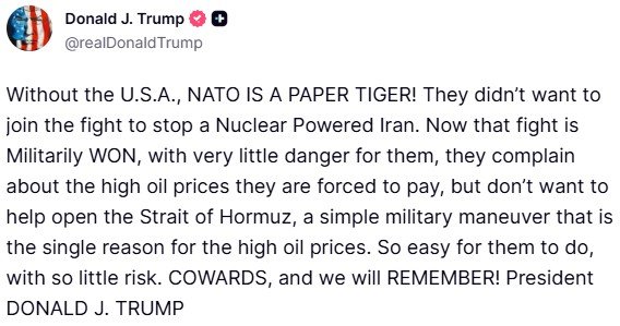 «Χωρίς τις ΗΠΑ, το NATO ΕΙΝΑΙ ΕΝΑΣ ΧΑΡΤΙΝΟΣ ΤΙΓΡΗΣ», λέει ο Αμερικανός πρόεδρος. «Δεν ήθελαν να συμμετέχουν στη μάχη για να σταματήσουν ένα Ιράν με πυρηνική δύναμη. Τώρα που στρατιωτικά η μάχη έχει κερδηθεί, με πολύ μικρό κίνδυνο για εκείνους, παραπονιούνται για τις υψηλές τιμές στο πετρέλαιο που αναγκάζονται να πληρώσουν αλλά δεν θέλουν να βοηθήσουν στο Στενό του Ορμούζ, μια απλή στρατιωτική κίνηση που είναι ο μόνος λόγος για τις υψηλές τιμές», σημειώνει.