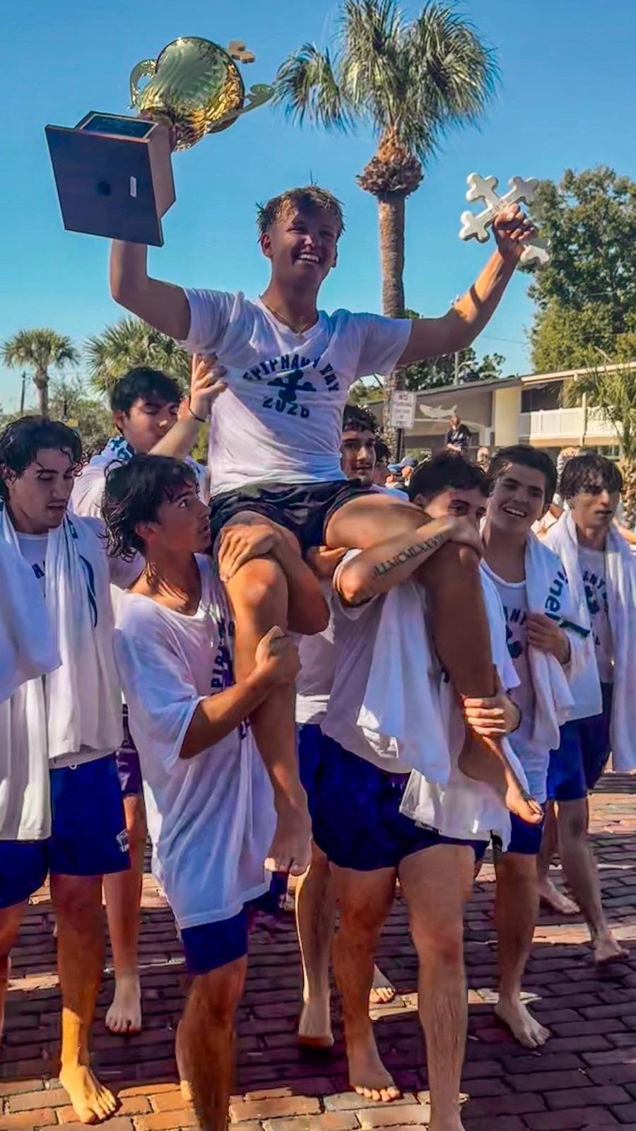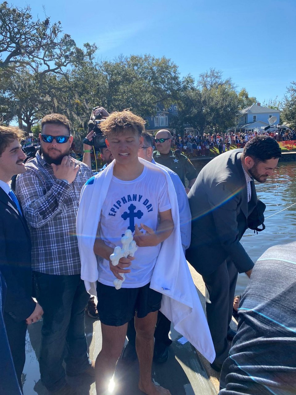 Τον σταυρό ανέσυρε από τα νερά του Σπρινγκ Μπάιου του Τάρπον Σπρινγκς ο 18χρονος Ελληνοαμερικανός φοιτητής 'Αθως Καρυστινός, ο οποίος ήταν ένας από τους 74 κολυμβητές που βούτηξαν για να πιάσουν το σύμβολο της πίστης μας.