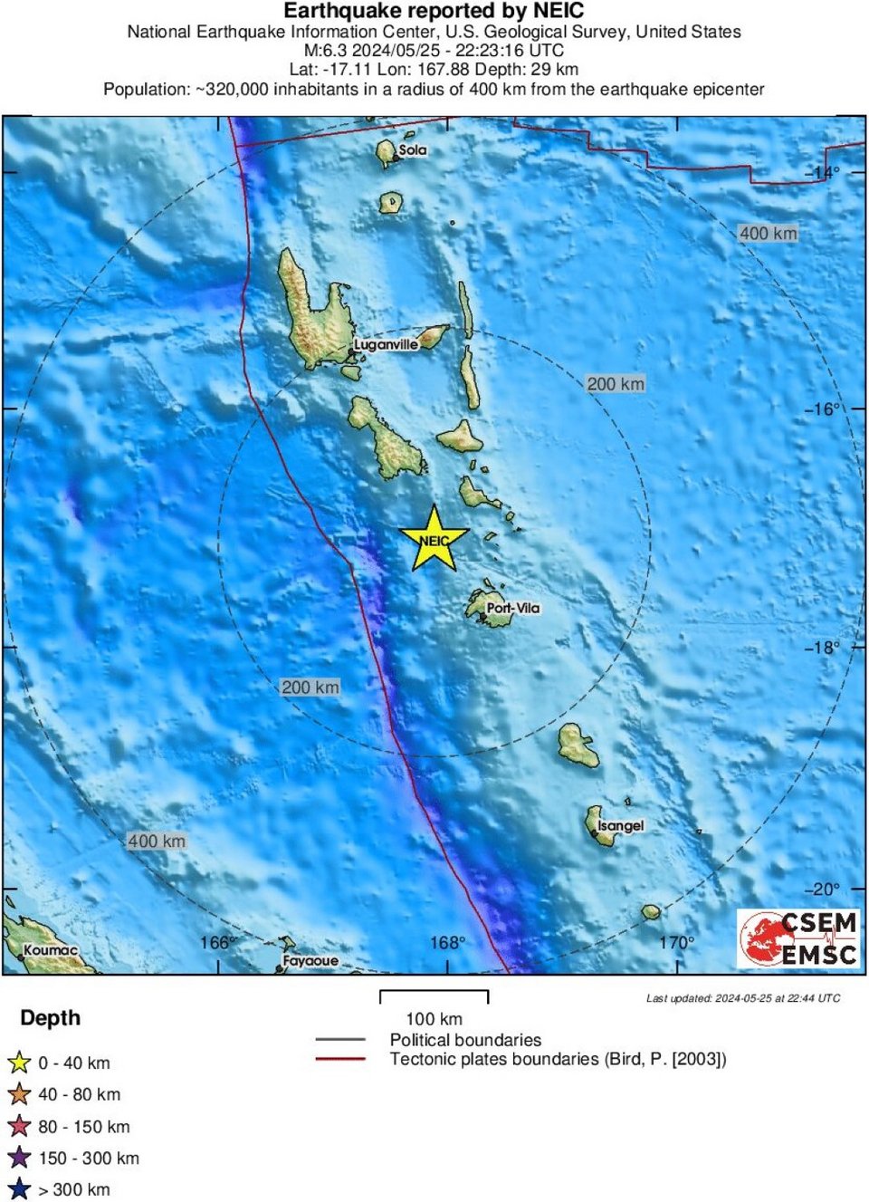 Σεισμός μεγέθους 6,4 βαθμών της κλίμακας Ρίχτερ σημειώθηκε τα ξημερώματα της Κυριακής, 26/05, στο αρχιπέλαγος του Βανουάτου στον Ειρηνικό Ωκεανό, σύμφωνα με το Ευρωμεσογειακό Σεισμολογικό Κέντρο (EMSC).