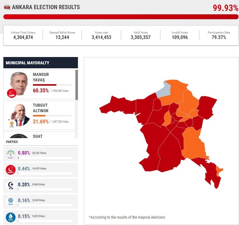 Στην Άγκυρα με καταμετρημένο το 99,93% των ψήφων, ο υποψήφιος της αντιπολίτευσης, Μανσούρ Γιαβάς, βγαίνει νικητής με 60,35%, έναντι του υποψηφίου του Ερντογάν, Τουργκούκ Αλτινόκ, στο 31,69%.