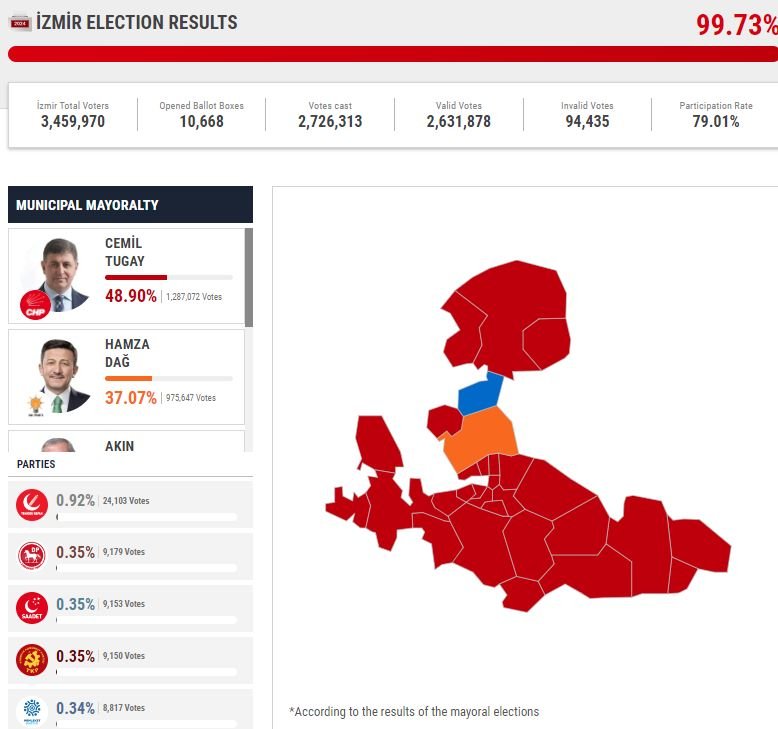 Όμως, πρώτο κόμμα ανακηρύσσεται το κεμαλικό CHP και σε εθνικό επίπεδο στις δημοτικές εκλογές, ενώ τρίτο αναδείχθηκε το κουρδικό DEM.