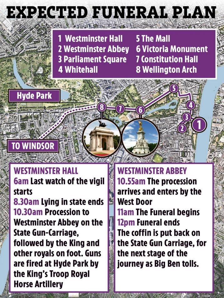 Η πορεία που θα ακολουθήσει η διαδικασία της κηδείας της βασίλισσας Ελισάβετ φαίνεται στην παρακάτω εικόνα, την οποία έδωσε στη δημοσιότητα η εφημερίδα «The Sun».
