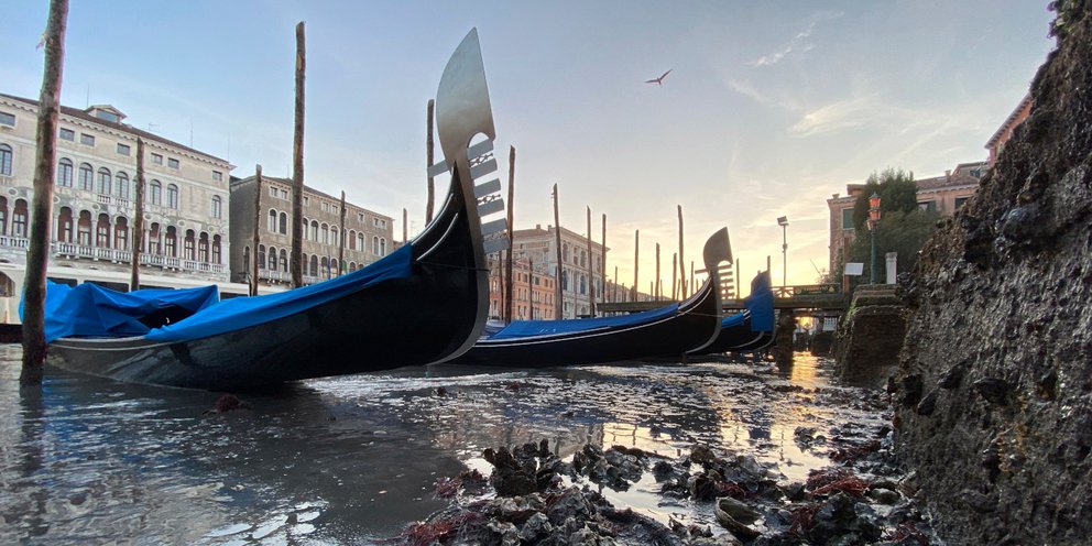 Αλλά το θέαμα τώρα σόκαρε τους κατοίκους και τους επισκέπτες της Serenissima με τις γόνδολες και τις βάρκες ακινητοποιημένες στα φημισμένα κανάλια που μετατράπηκαν σ’ έναν βούρκο λάσπης καθώς η στάθμη του νερού έπεσε στα 45 εκ. κάτω από τη στάθμη της θάλασσας, όπως φαίνεται και από τις εικόνες που κάνουν το γύρο του κόσμου.