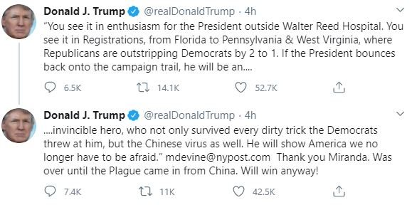 «Το βλέπετε στον ενθουσιασμό για τον Πρόεδρο έξω από το Νοσοκομείο Walter Reed. Το βλέπετε στις Εγγραφές, από τη Φλόριντα έως την Πενσυλβάνια και τη Δυτική Βιρτζίνια, όπου οι Ρεπουμπλικάνοι ξεπερνούν τους Δημοκρατικούς κατά 2 προς 1. Εάν ο Πρόεδρος επιστρέψει στην προεκλογική του εκστρατεία, θα είναι... ανίκητος ήρωας, ο οποίος όχι μόνο επέζησε από κάθε βρώμικο κόλπο που του πέταξαν οι Δημοκρατικοί, αλλά και ο κινεζικός ιός. Θα δείξει στην Αμερική ότι δεν χρειάζεται πλέον να φοβόμαστε!», έγραψε χαρακτηριστικά.
