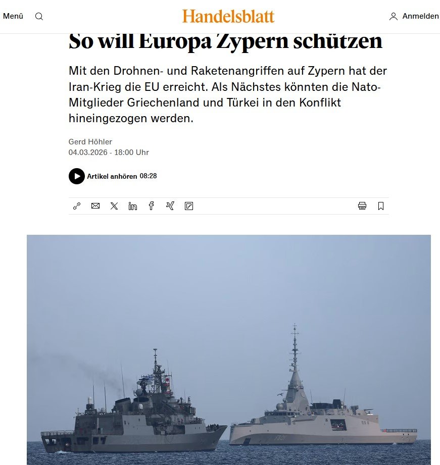 «Την περασμένη χρονιά η Κύπρος κατέγραψε έσοδα από τον τουρισμό ύψους 3,7 δισεκατομμυρίων ευρώ, σημειώνοντας αύξηση 15,2% σε σχέση με το 2024 και καταγράφοντας νέο ρεκόρ. Οι Βρετανοί αποτελούν τη μεγαλύτερη ομάδα επισκεπτών στο νησί. Ωστόσο, αρκετές αεροπορικές εταιρείες, μεταξύ των οποίων η EasyJet και η British Airways, έχουν ήδη αναστείλει προσωρινά τις πτήσεις τους προς την Κύπρο. Εάν ο πόλεμος συνεχιστεί, υπάρχει φόβος ότι ο τουρισμός θα μπορούσε να υποστεί σημαντική πτώση μέσα στη χρονιά», σημειώνει ο ανταποκριτής της «Handelsblatt» στην Ελλάδα, Γκερντ Χέλερ.
