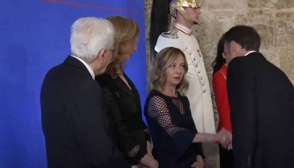 Η Ιταλίδα πρωθυπουργός Τζόρτζια Μελόνι, όπως μπορεί να δει κανείς στο βίντεο, τον διαπέρασε με ένα από τα διαγώνια βλέμματά της, και όταν ο Μακρόν τής φίλησε ψυχρά το χέρι, εκείνη του το ανταπέδωσε με ένα παγωμένο βλέμμα.